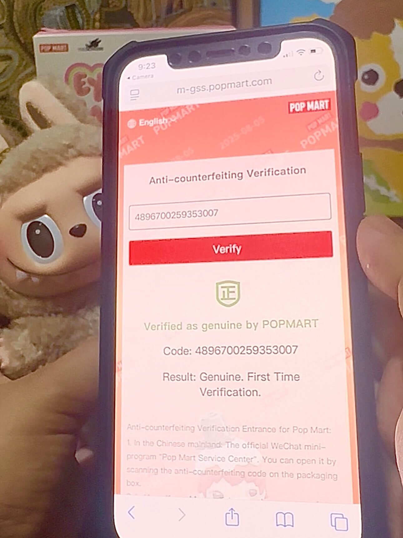 A real QR code takes you straight to Pop Mart’s official site, where you can enter the serial number and confirm it’s authentic.